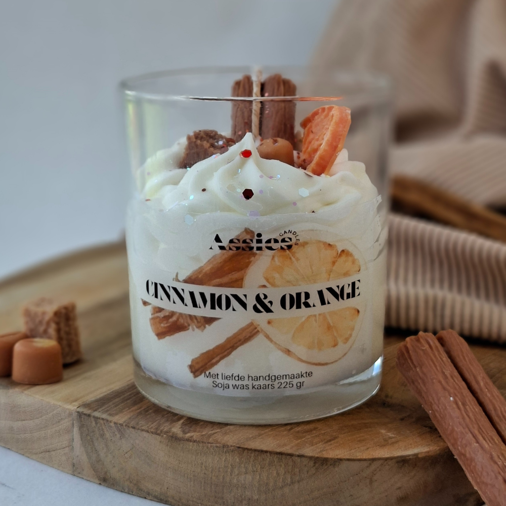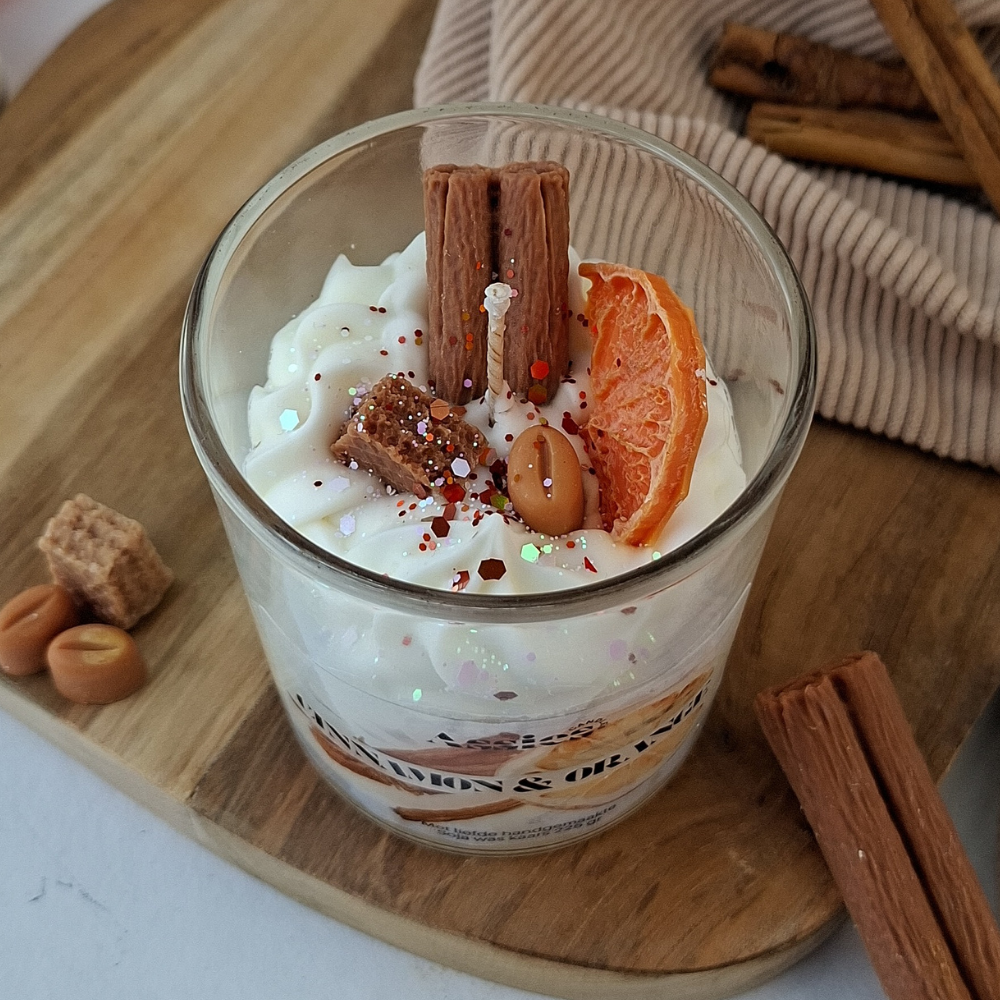 Met mooie details van sinaasappel, kaneel, koekje en sojawas slagroom, maakt deze kaars tot een echte blikvanger!