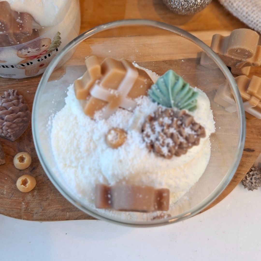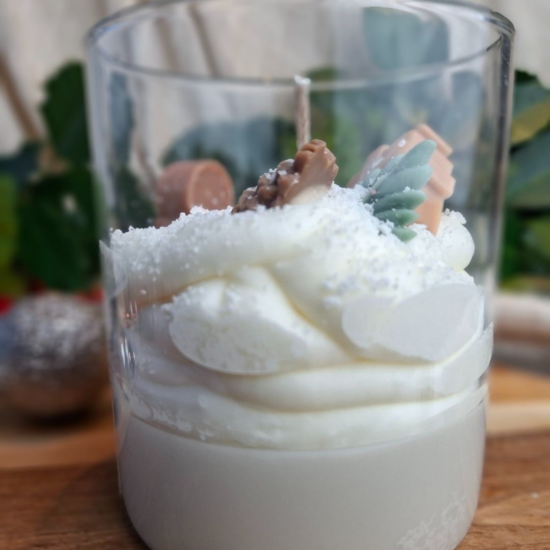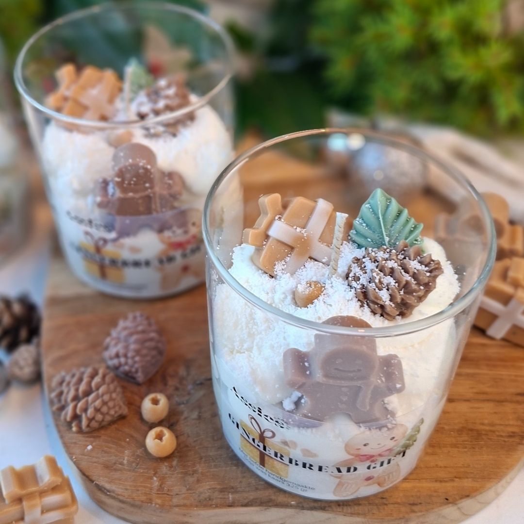Een vrolijk peperkoekmannetje dat zich verstopt in een laag sneeuw. De opgeklopte was heeft het uiterlijk van een dik pak sneeuw, kijk hoe mooi de sneeuw tegen het glas aandrukt. De kaars heeft een cadeautje voor jou bovenop de kaars en details van een dennenappel, blaadje en besje in mooie natuurlijke tinten!