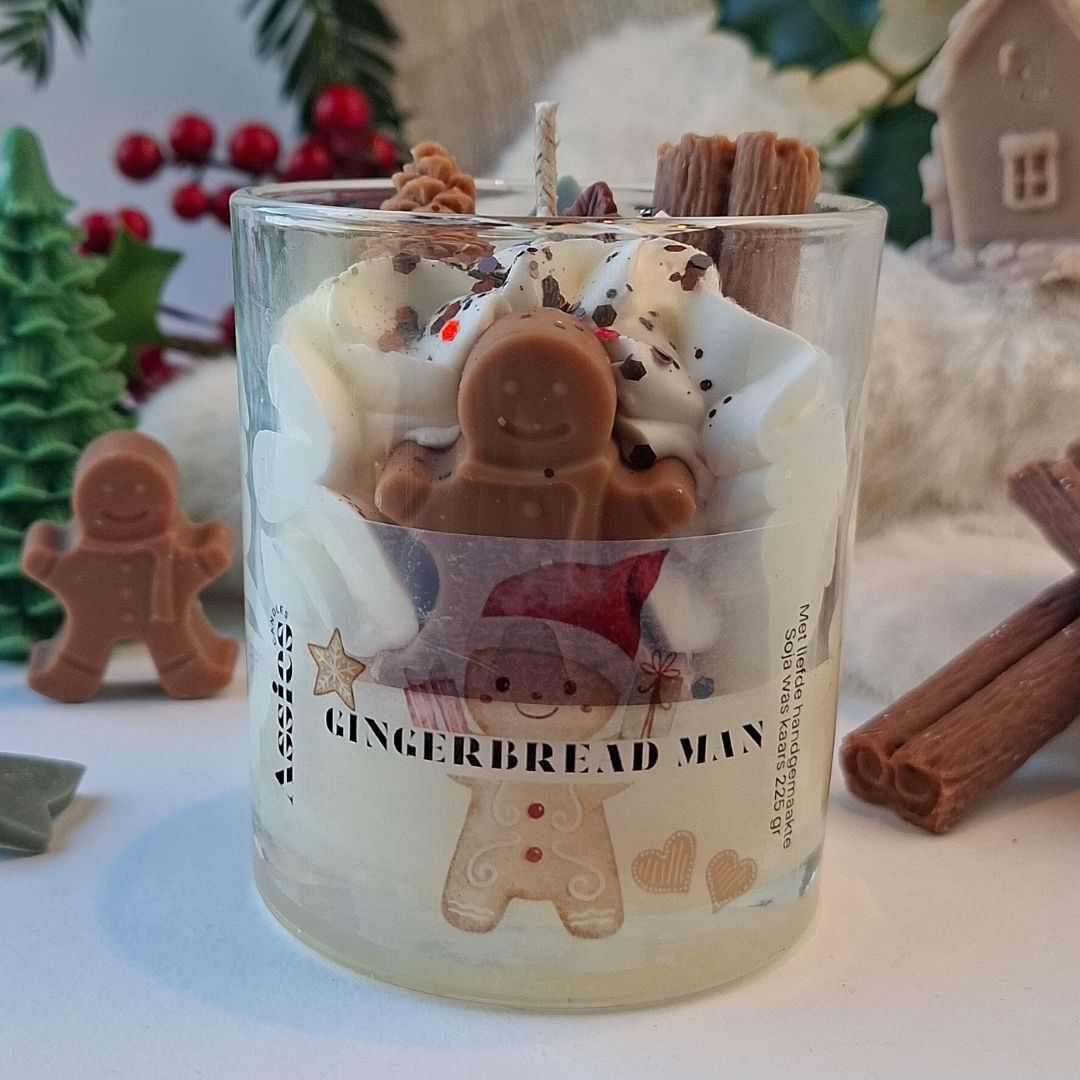Met een gezellige peperkoekman in het venster is deze kaars een echte blikvanger voor in je huis, met details van een dennenappel en kaneel in mooie opgeklopte sojwas. Geniet van deze kaars in mooie natuurlijke kleuren, de kaars brengt een lach op je gezicht.