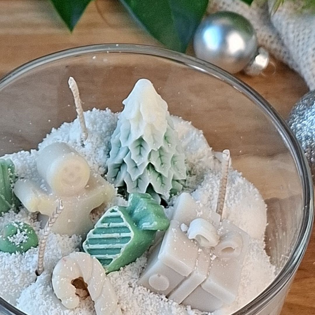 Een cadeau in een glas, deze Winter’s Gift met details van een schattig peperkoekmannetje, een kerstboom verzonken in de opgeklopte sojawas dat op sneeuw lijkt, een spannend cadeautje, een zoete zuurstok en dat alles in mooie zachte tinten. Kijk hoe mooi de opgeklopte was als slagroom tegen het glas aan drukt!