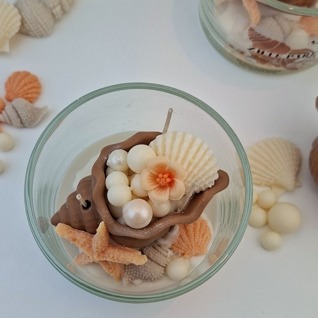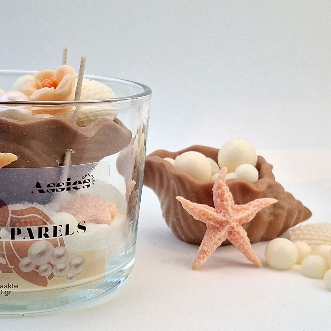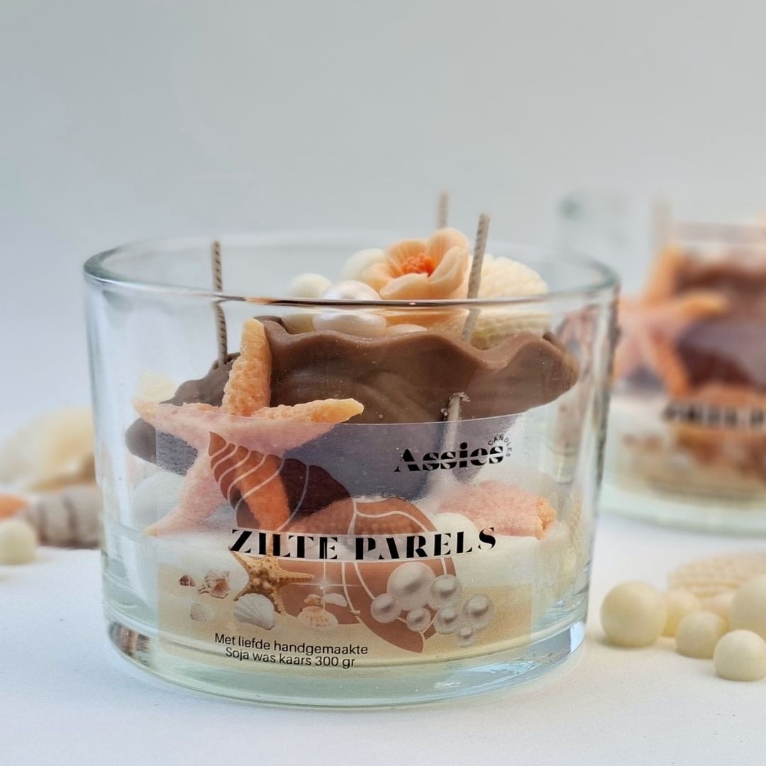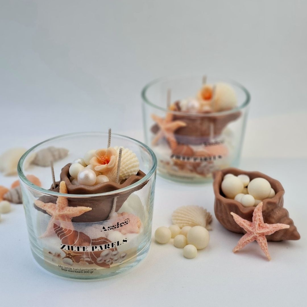 Zilte Parels: Ontdek de geheimen van de diepzee met deze betoverende schelpkaars. In het hart van de wax ligt een prachtige Triton-schelp, van sojawas, verscholen, omringd door glanzende sojawas parels, fijne bloesems en een rustieke zeester. Het is alsof je een schat hebt gevonden op een verlaten wit strand. Een kunstwerk van sojawas dat niet alleen je huis heerlijk laat ruiken, maar ook een stukje oceaan-magie aan je interieur toevoegt.